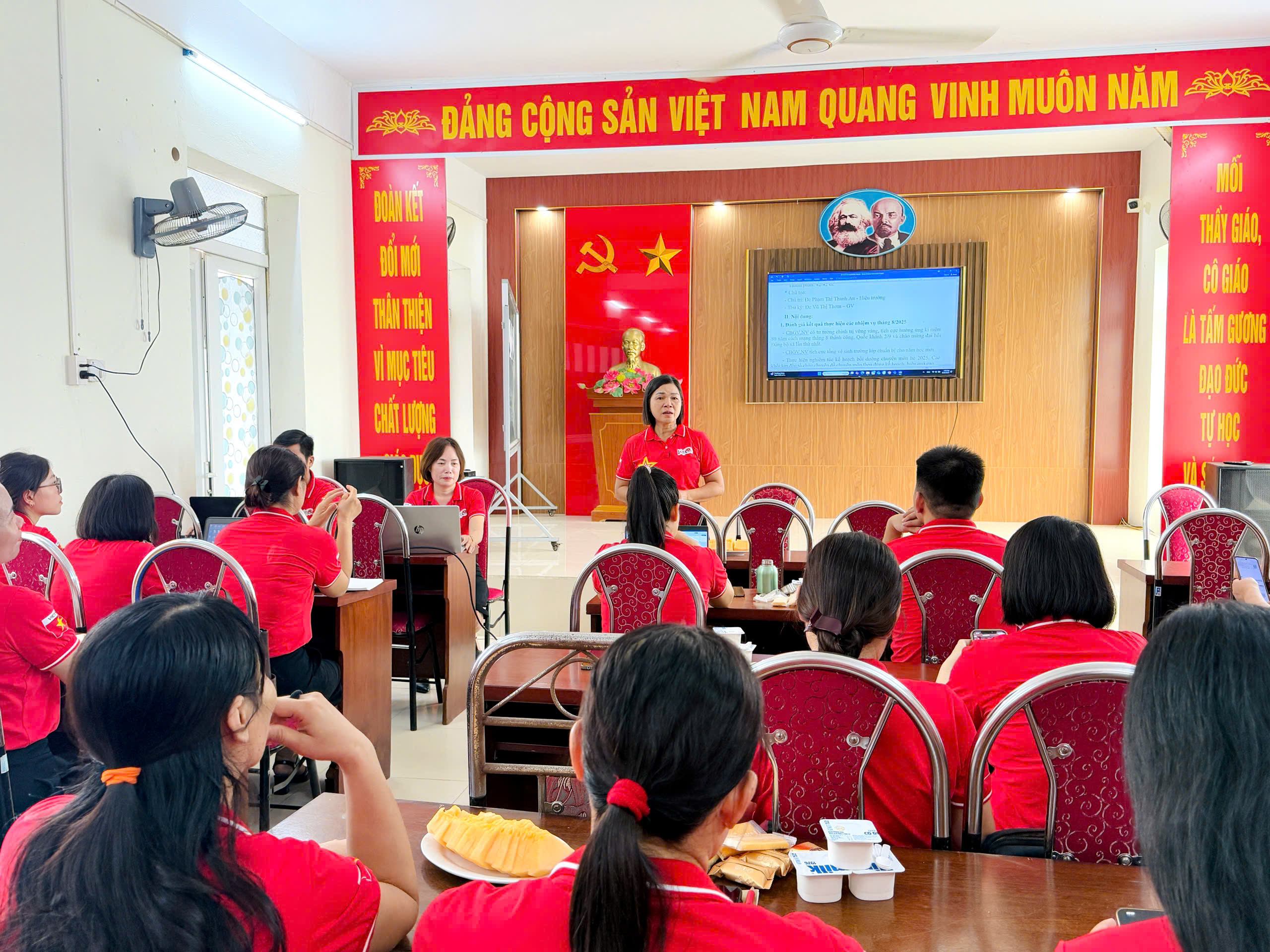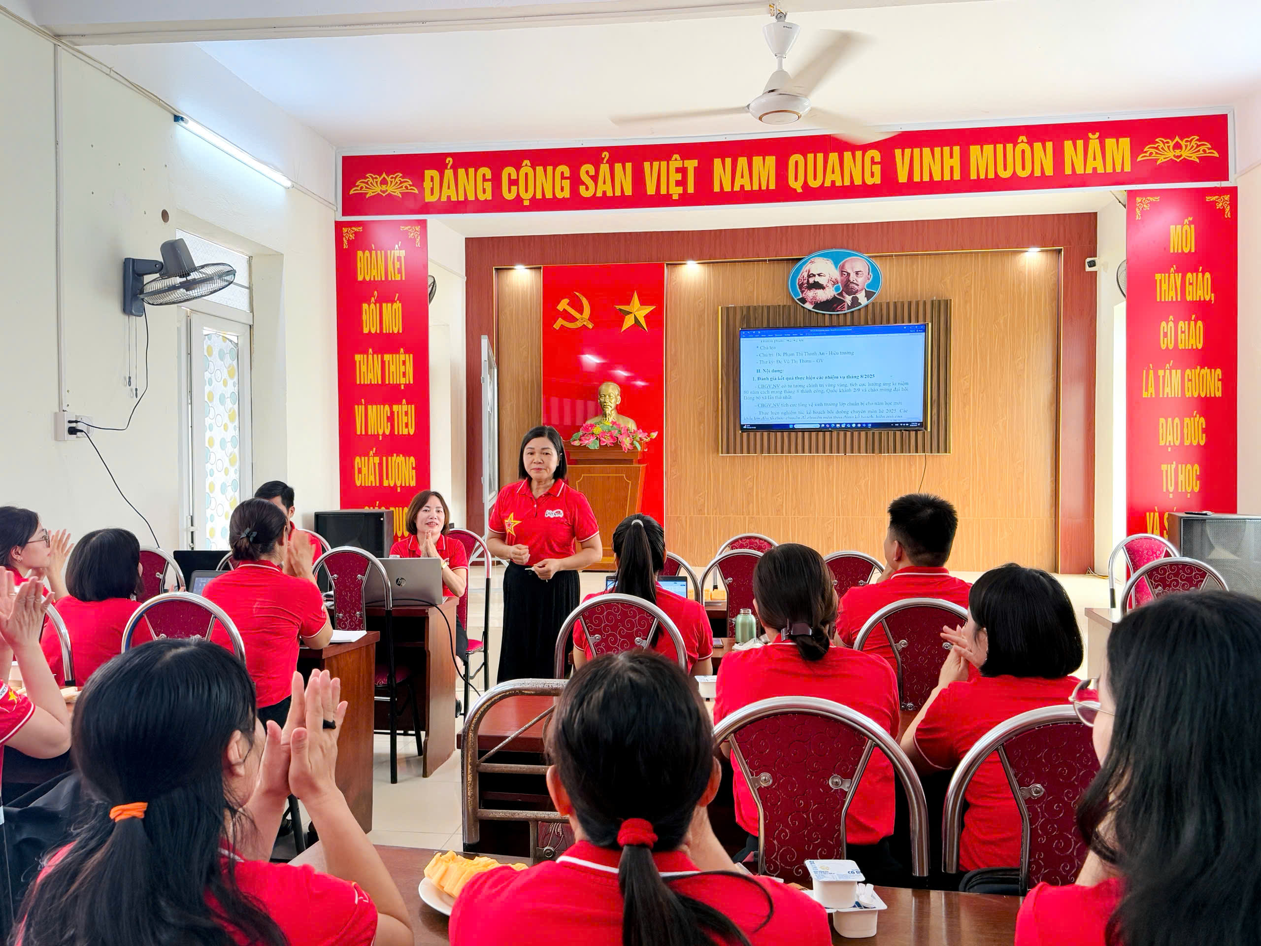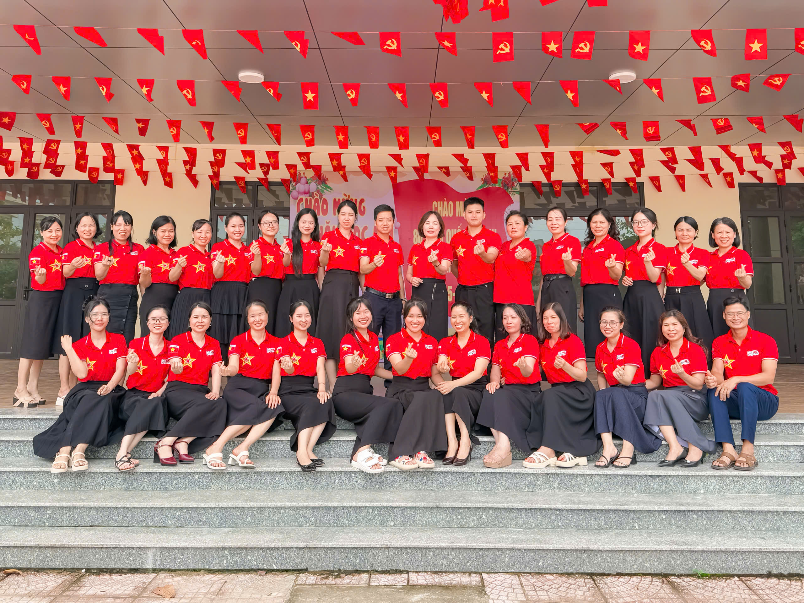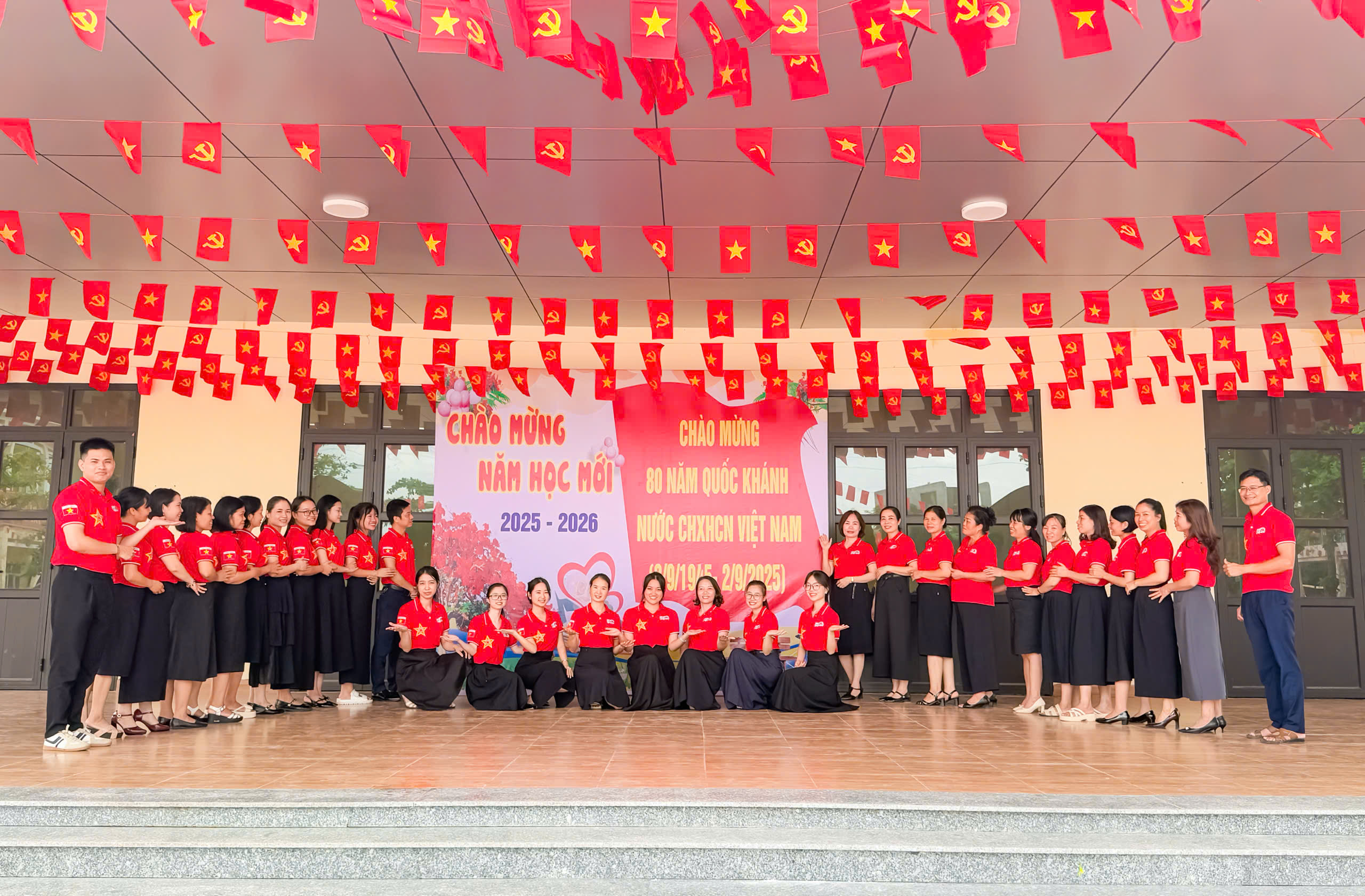 🌺🌺 Ngay từ cổng trường, sân trường đến các lớp học, khung cảnh trở nên bừng sáng với cờ Tổ quốc, băng rôn, khẩu hiệu trang hoàng rực rỡ. Màu đỏ thắm của quốc kỳ tung bay, hòa cùng sắc áo cờ đỏ sao vàng của thầy cô và những lá cờ nhỏ trên tay học sinh, tạo nên bức tranh đoàn kết, trang nghiêm và tràn đầy tự hào. Các lớp học thêm sinh động với bảng trang trí, khẩu hiệu “Mừng Quốc khánh 2/9” và hình ảnh lịch sử, vừa tôn vinh ngày lễ trọng đại vừa giúp học sinh hiểu sâu ý nghĩa thiêng liêng của Tổ quốc.