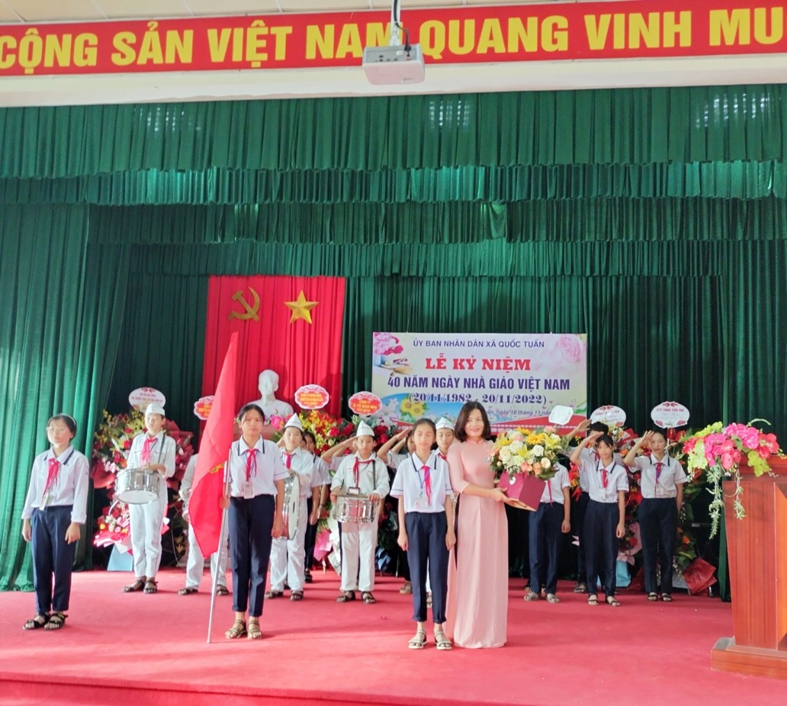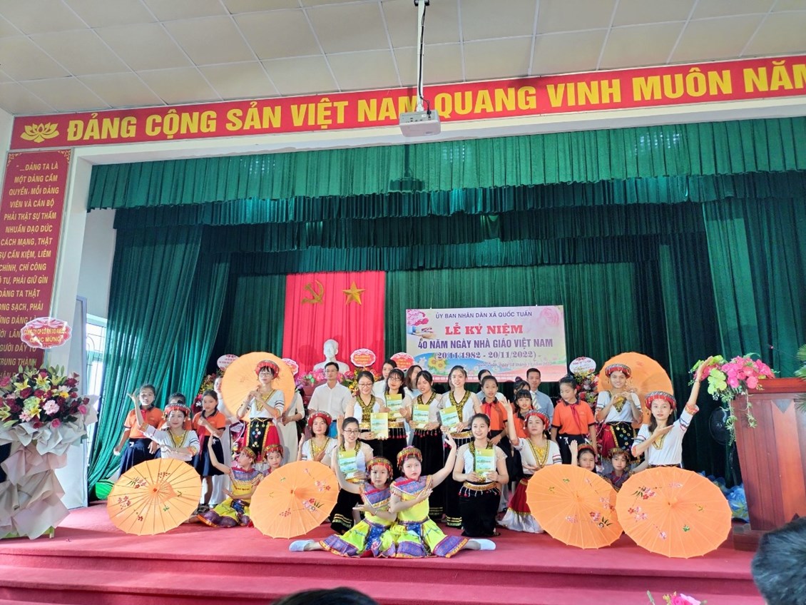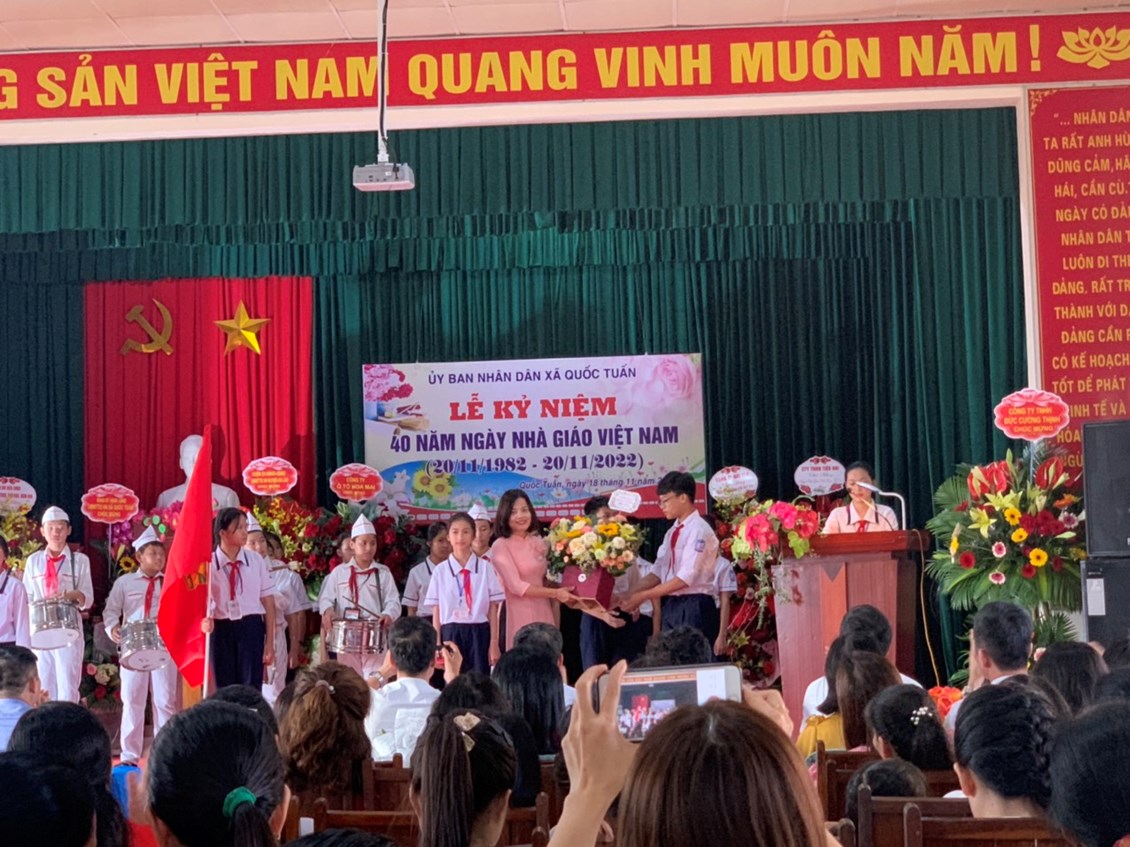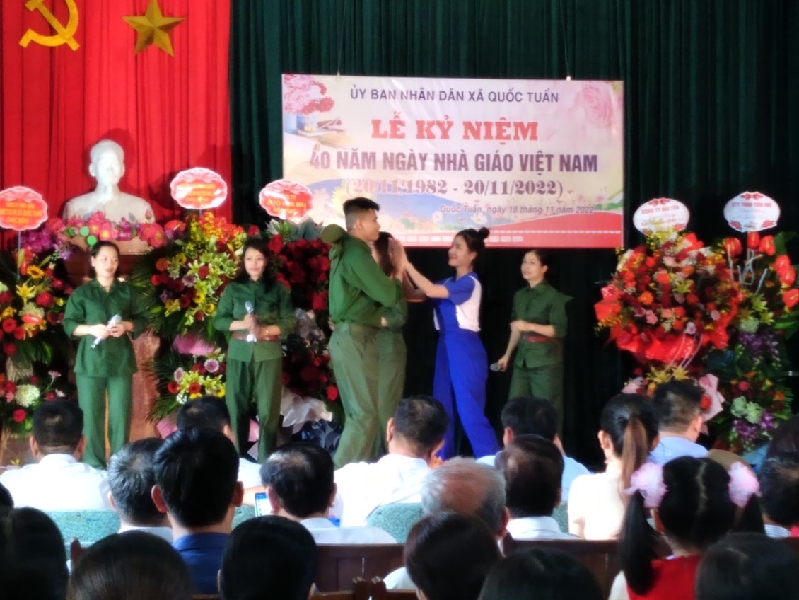 Mở đầu hội nghị là phần văn nghệ chào mừng do các thầy cô giáo và học sinh ba nhà trường bao gồm các tiết mục múa hát đặc sắc về mái trường, kỉ niệm tuổi học trò, ca ngợi công ơn lớn lao của thầy cô- những người chèo đò thầm lặng đưa lớp lớp học sinh cập bến vinh quang. Trong diễn văn khai mạc, đồng chí Phó chủ tịch UBND xã Quốc Tuấn một lần nữa nhắc đến và đề cao đạo lí thầy trò, nhấn mạnh tầm quan trọng của giáo dục đào tạo cũng như sự quan tâm- đãi ngộ của Đảng bộ và nhân dân trong xã dành cho các thầy cô ở cả ba cấp học: THCS, Tiểu học và Mầm non. Hội nghị đã vinh danh 30 thầy cô tâm huyết- sáng tạo của 3 cấp học; 2 cô giáo có học sinh là thủ khoa trong kì thi vào lớp 10 trường THPT An Lão và THPT Quốc Tuấn, các thầy cô đạt Chiến sĩ thi đua, giáo viên giỏi các cấp, giáo viên có học sinh giỏi đạt giải của năm học 2021- 2022. Đặc biệt có các thầy cô đã nhận được bằng khen của Bộ GD- ĐT, của UBND Thành phố Hải Phòng, của Chủ tịch UBND Thành phố Hải Phòng. Đó là những tấm gương sáng, là niềm tự hào của giáo dục xã Quốc Tuấn.