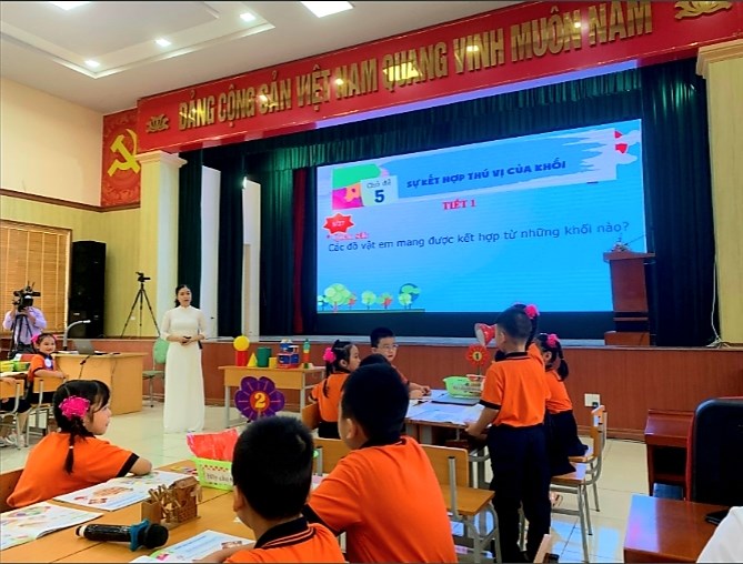 Trong tiết học, cô giáo đã thiết kế bài giảng rất linh hoạt, hấp dẫn, lôi cuốn, đầy đủ nội dung kiến thức, phát huy được năng lực của học sinh.Vào bài dạy cô Thơm cho học sinh cùng chơi "nhìn vật đoán khối". Học sinh được làm trắc nghiệm về hình khối của vật. Bằng việc đưa ra hình quả cam, chiếc nón, rubic...cô cho học sinh chọn khối của vật và cùng kiểm tra kết quả. Qua đó học sinh được nhớ lại khối như: khối trụ, hộp chữ nhật, lập phương...