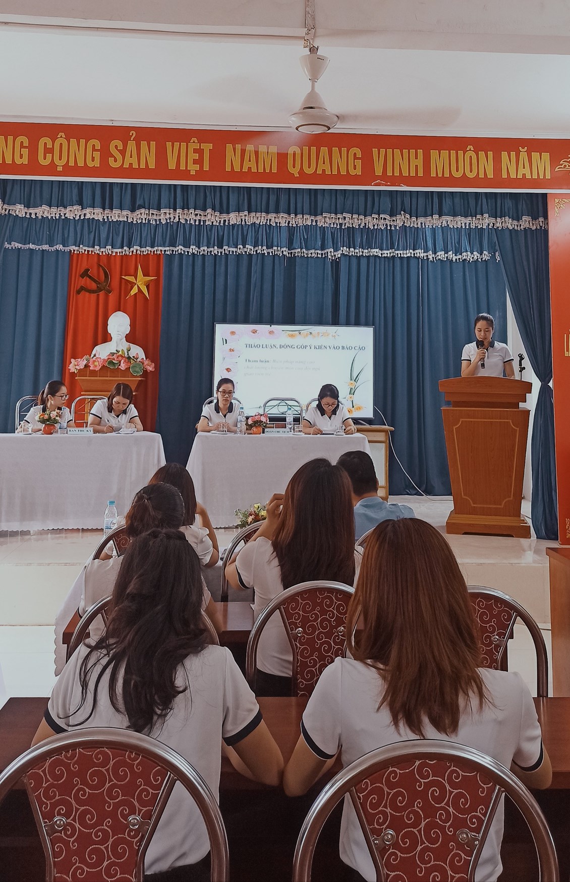Sau nghi lễ trang nghiêm, Đại hội đã nghe đồng chí Bí thư chi đoàn Vũ Thị Hương Giang Báo cáo tổng kết công tác Đoàn và phong trào thanh niên năm 2021- 2022 và đề ra phương hướng hoạt động năm 2022- 2023 . Để bổ sung cho bản báo cáo và phương hướng thêm đầy đủ, chi tiết, đại hội đã thảo luận sôi nổi, đóng góp nhiều ý kiến với tinh thần đoàn kết, xây dựng và ý thức trách nhiệm cao. Đ/c Nguyễn Thị Hải Hà trình bày báo cáo nâng cao chất lượng chuyên môn của đội ngũ giáo viên trẻ. Là một giáo viên vừa bước vào nghề, đ/c Lê Thị Mai Trang mạnh dạn đóng góp ý kiến về việc nâng cao tính xung kích của đoàn viên trong các hoạt động Đoàn, Đội. Đó là những ý kiến vô vùng bổ ích cho hoạt động của chi đoàn trong năm học mới, giúp mỗi đồng chí đoàn viên đều có thể vận dụng phù hợp với bản thân để phấn đấu đạt được những chỉ tiêu mà Đại hội đề ra trong năm học 2022 - 2023.