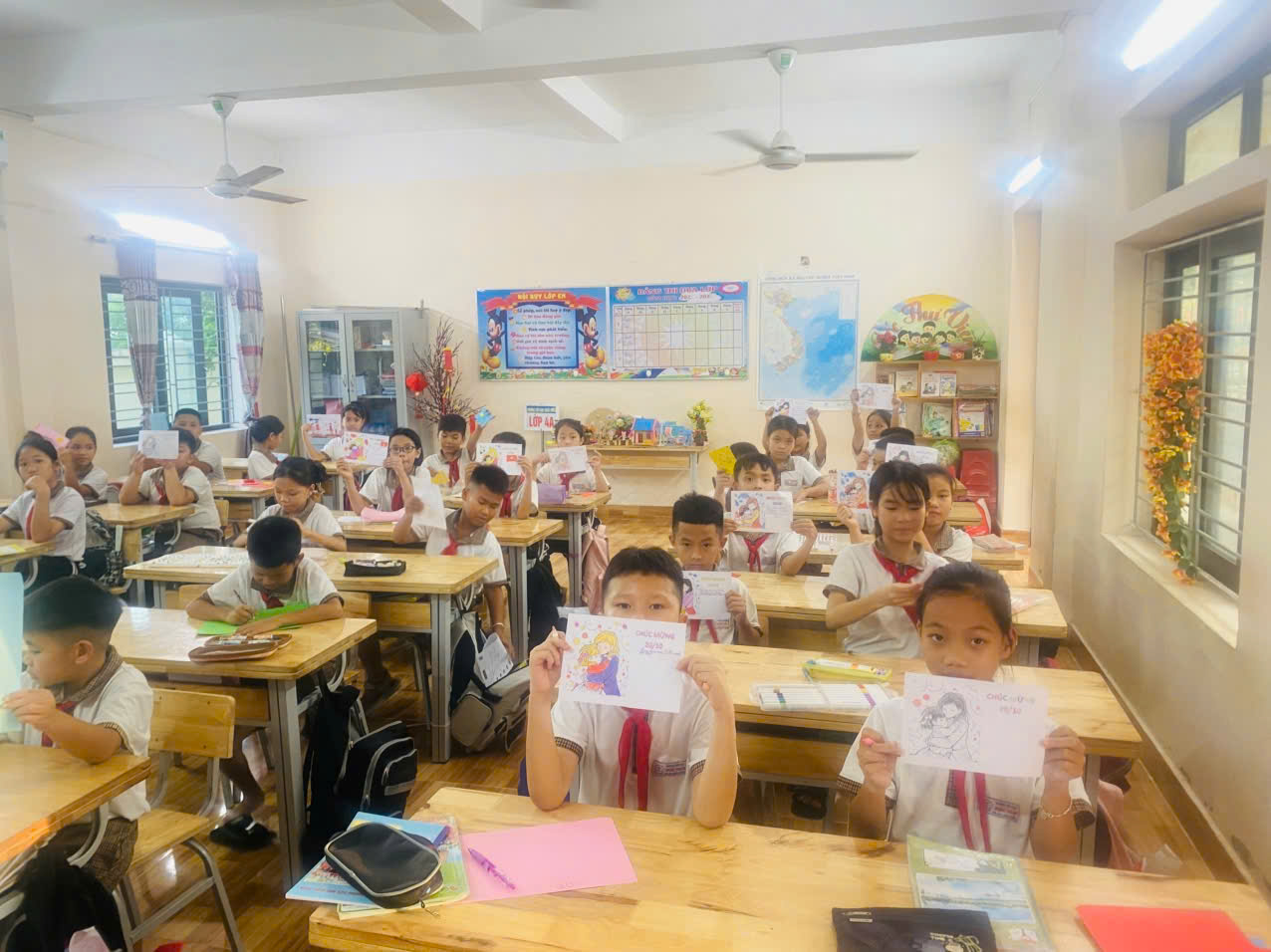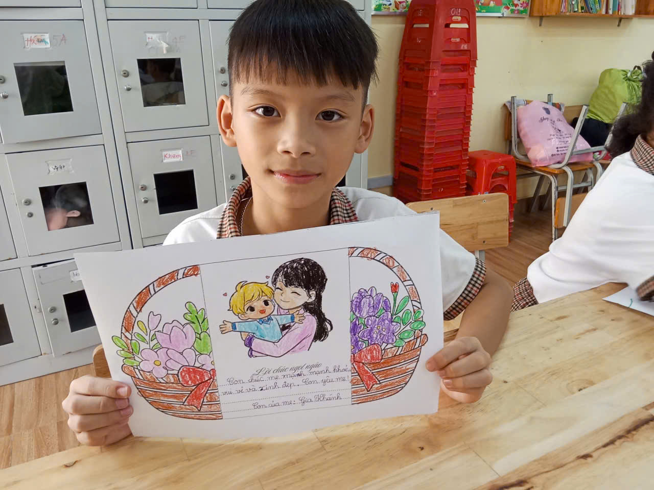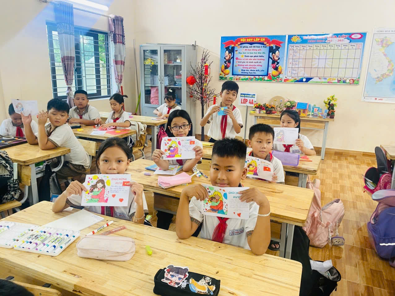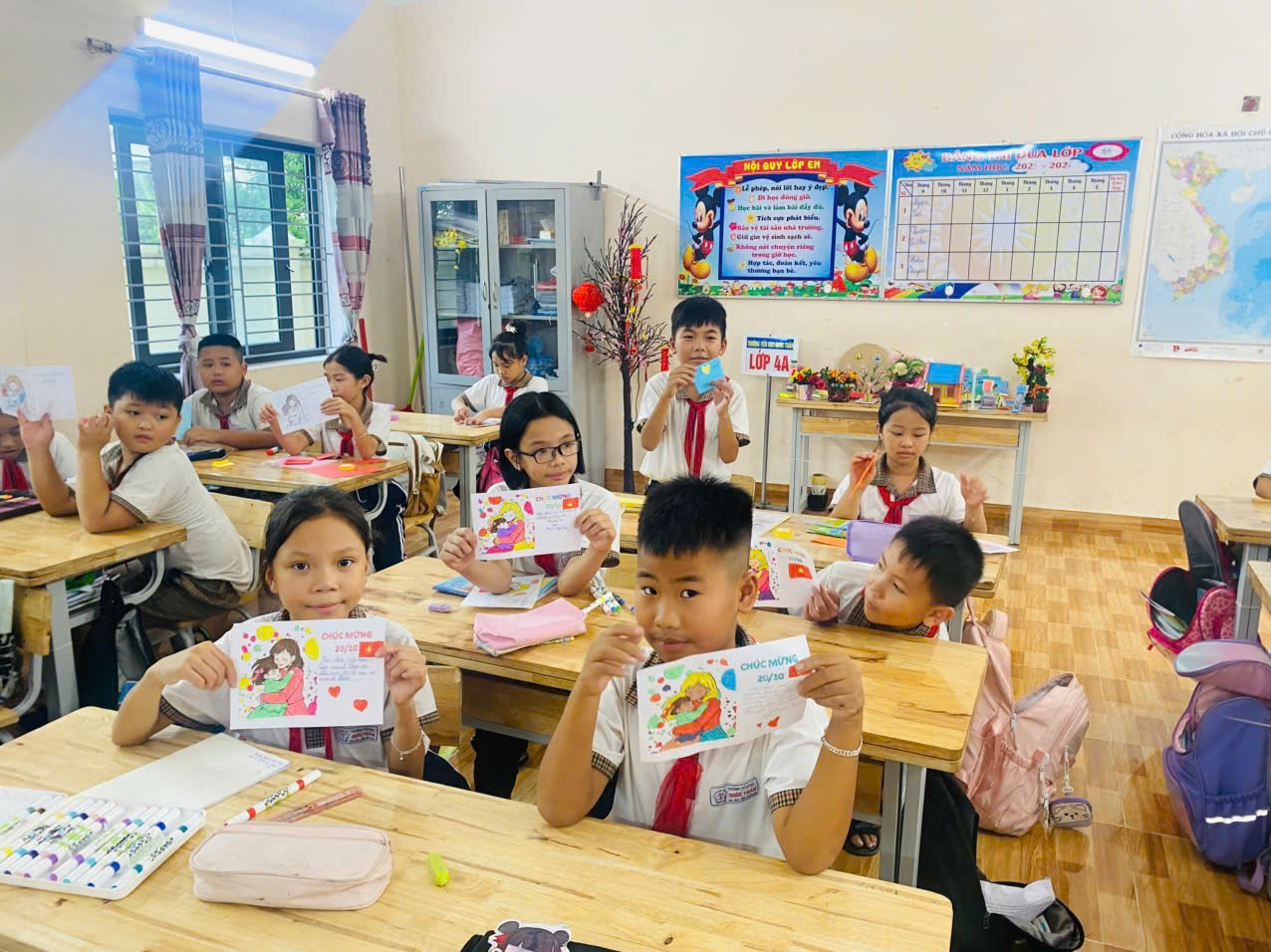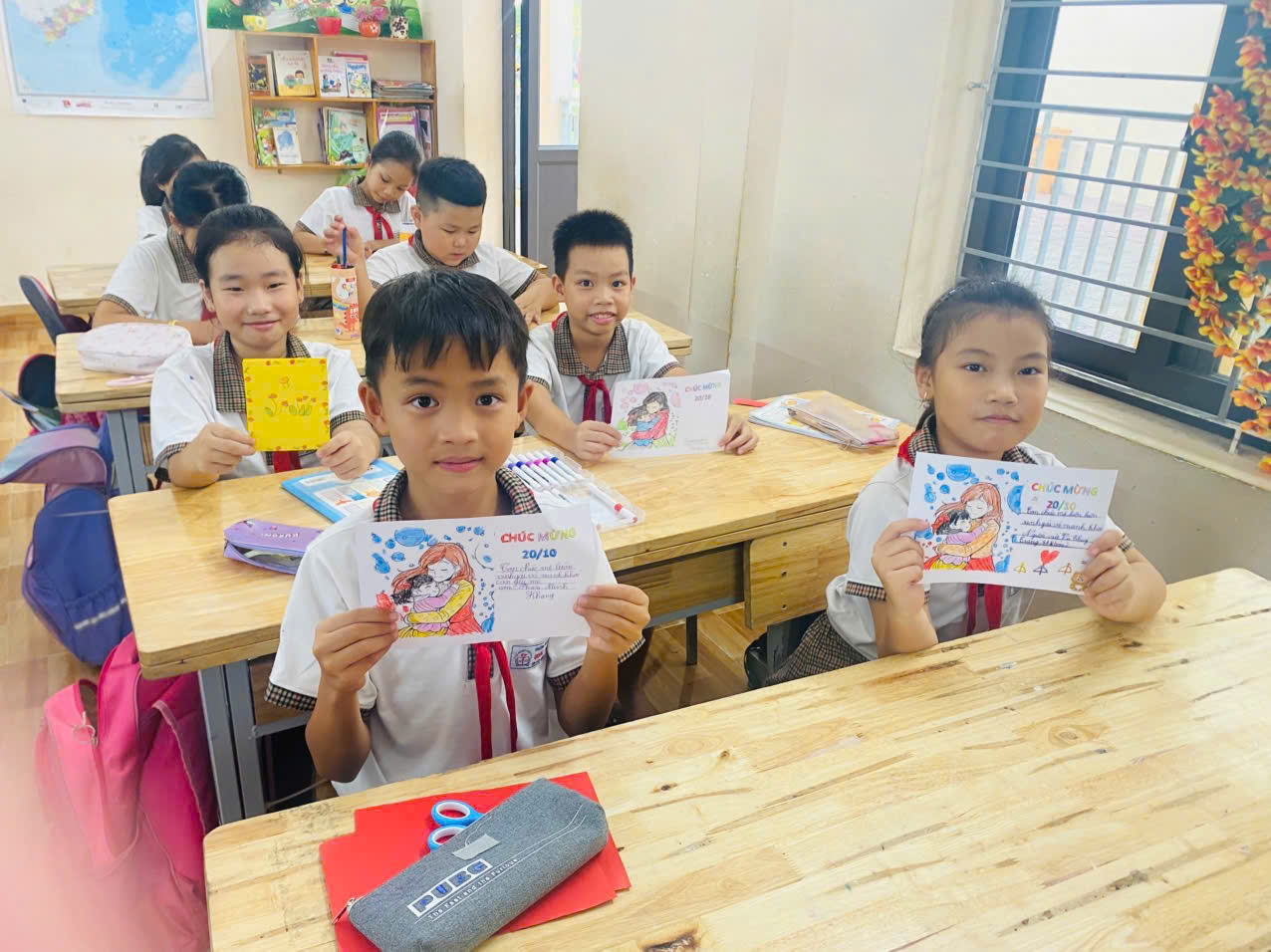 Ở mỗi lớp học, các bạn còn tự tay làm những tấm thiệp xinh xắn, sáng tạo để gửi tặng bà, mẹ, cô giáo - những người luôn quan tâm, dạy dỗ và yêu thương chúng ta mỗi ngày.