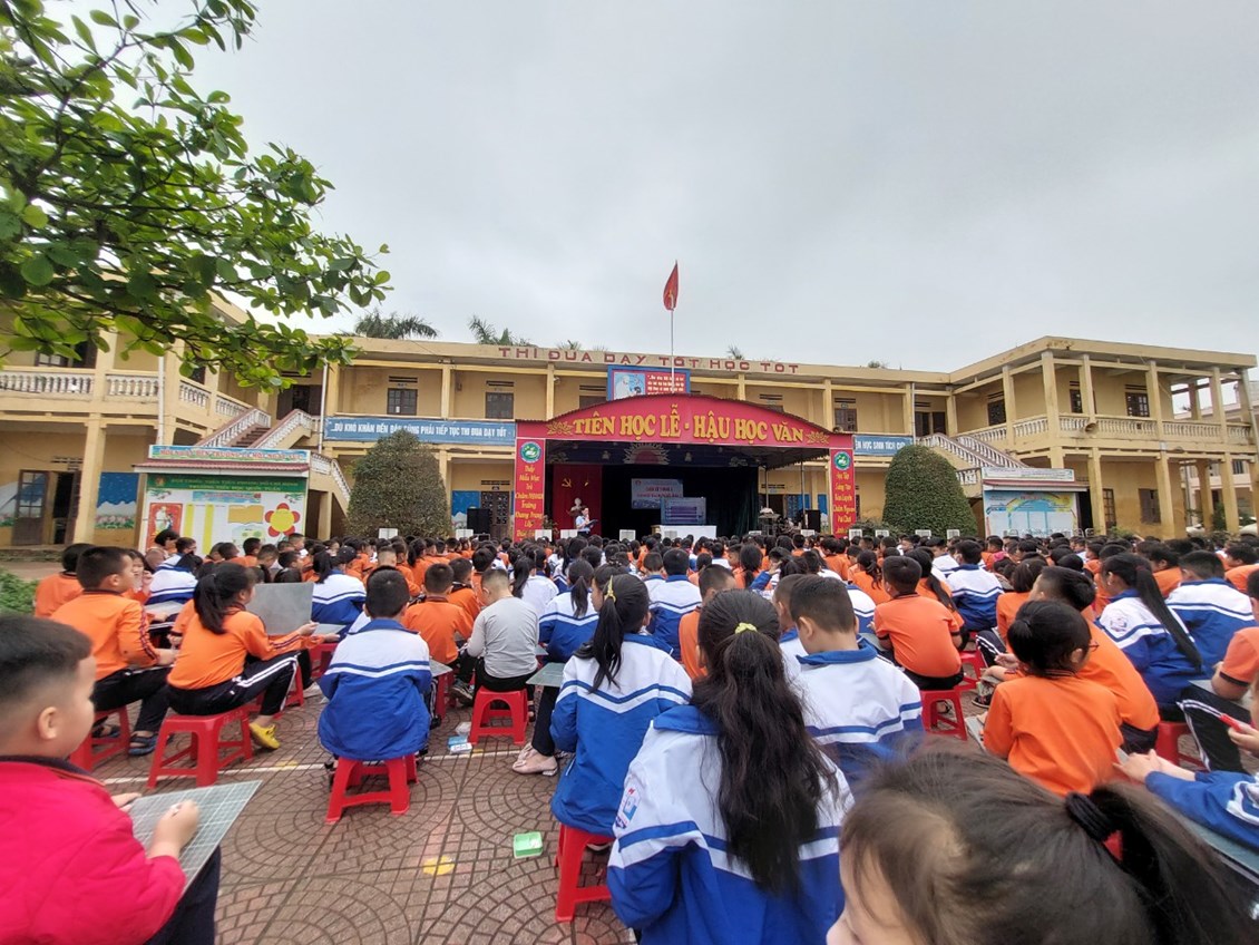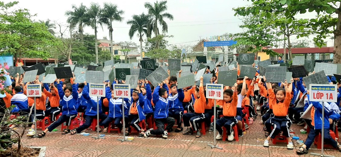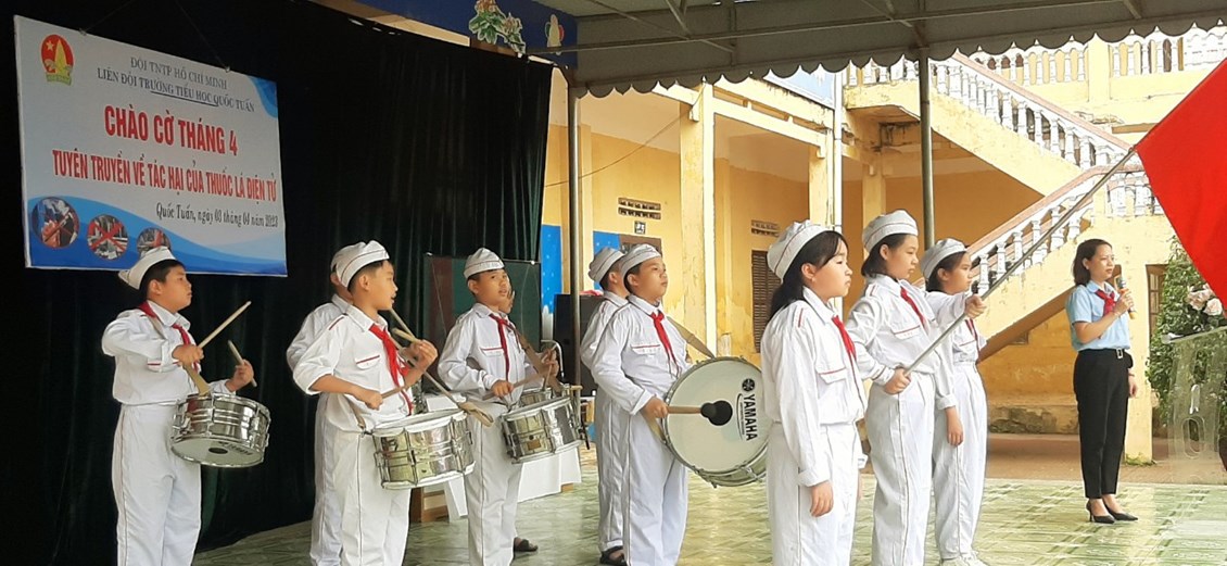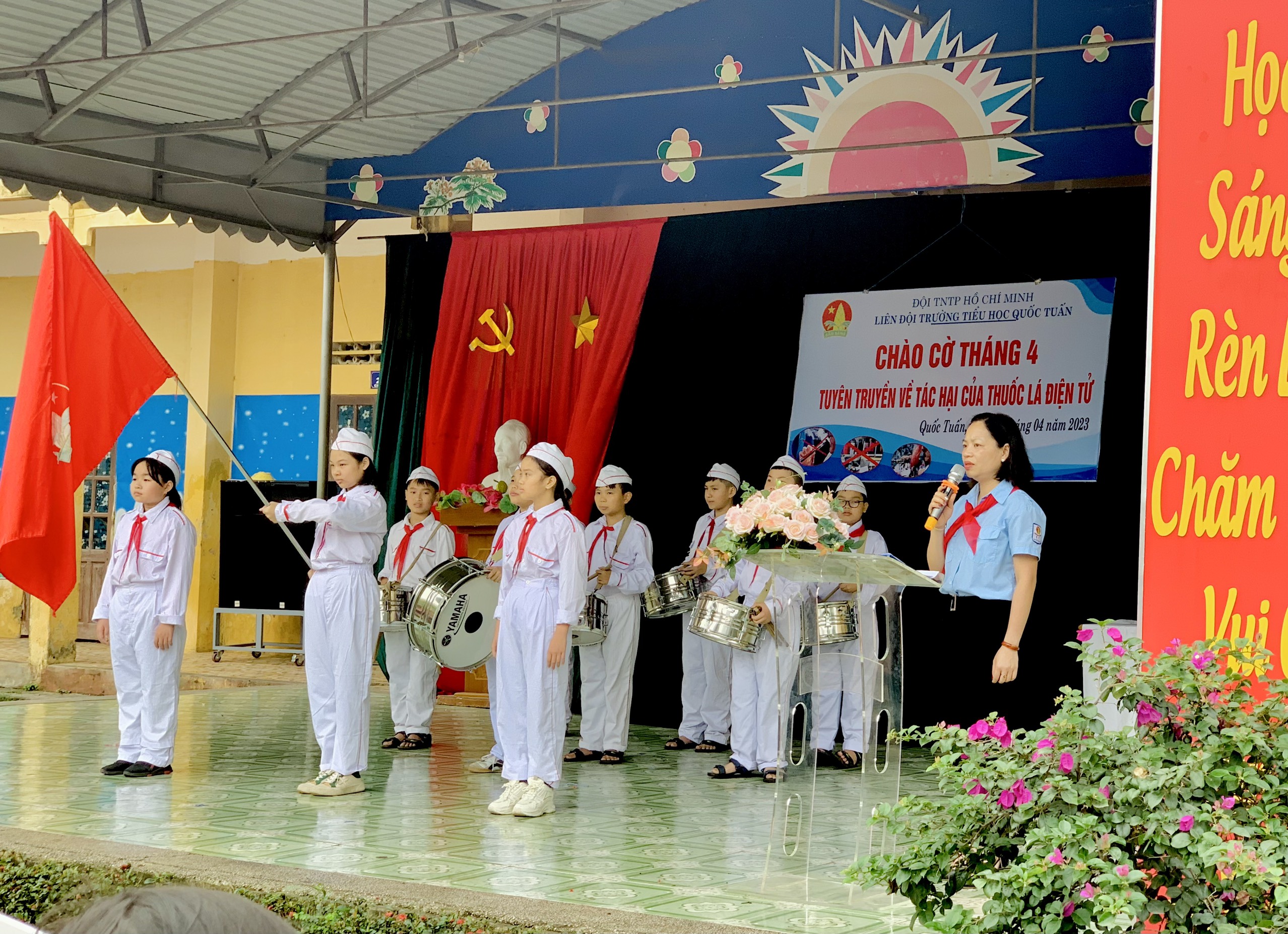 Cô Đặng Thu Hà - Tổng phụ trách đã đánh giá kết quả thực hiện kế hoạch công tác Đội của từng Chi đội và các lớp trong tháng 3 : Các chi đội lớp 4, 5 tham gia viết thư UPU Quốc tế, em Vũ Thảo Nguyên đạt giải nhì trong hội thi Sơn ca cấp huyện, các lớp thực hiện tốt nề nếp, giữ vệ sinh trường lớp. Sau phần tổng kết thứ tự của các lớp, cô Đặng Thu Hà tổ chức chương trình "Tuyên truyền về tác hại của thuốc lá điện tử" được thực hiện dưới hình thức "Rung chuông vàng". Bộ 10 câu hỏi ngắn gọn, dễ hiểu do cô Tổng phụ trách và các thầy cô trong Đoàn thanh niên nhà trường biên soạn. Từ khối 1 đến khối 5, tất cả các học sinh đều tham gia bằng cách viết câu trả lời vào bảng con. Kết thúc 10 câu hỏi, bạn nhỏ nào cũng hiểu thuốc lá điện tử vô cùng nguy hại với học sinh và có những biện pháp bảo vệ bản thân để không bị sa đà vào tệ nạn ấy. Phát biểu sau phần thi "Rung chuông vàng", cô Nguyễn Thị Thanh Trà - Bí thư chi bộ- Hiệu trưởng nhà trường- một lần nữa nhấn mạnh lại sự nguy hiểm của thuốc lá điện tử . Cô cũng hi vọng mỗi học sinh nhà trường sẽ là một tuyên truyền viên nhỏ tuổi để lan tỏa ý nghĩa của phần thi "Rung chuông vàng" ngày hôm nay tới tất cả mọi người.