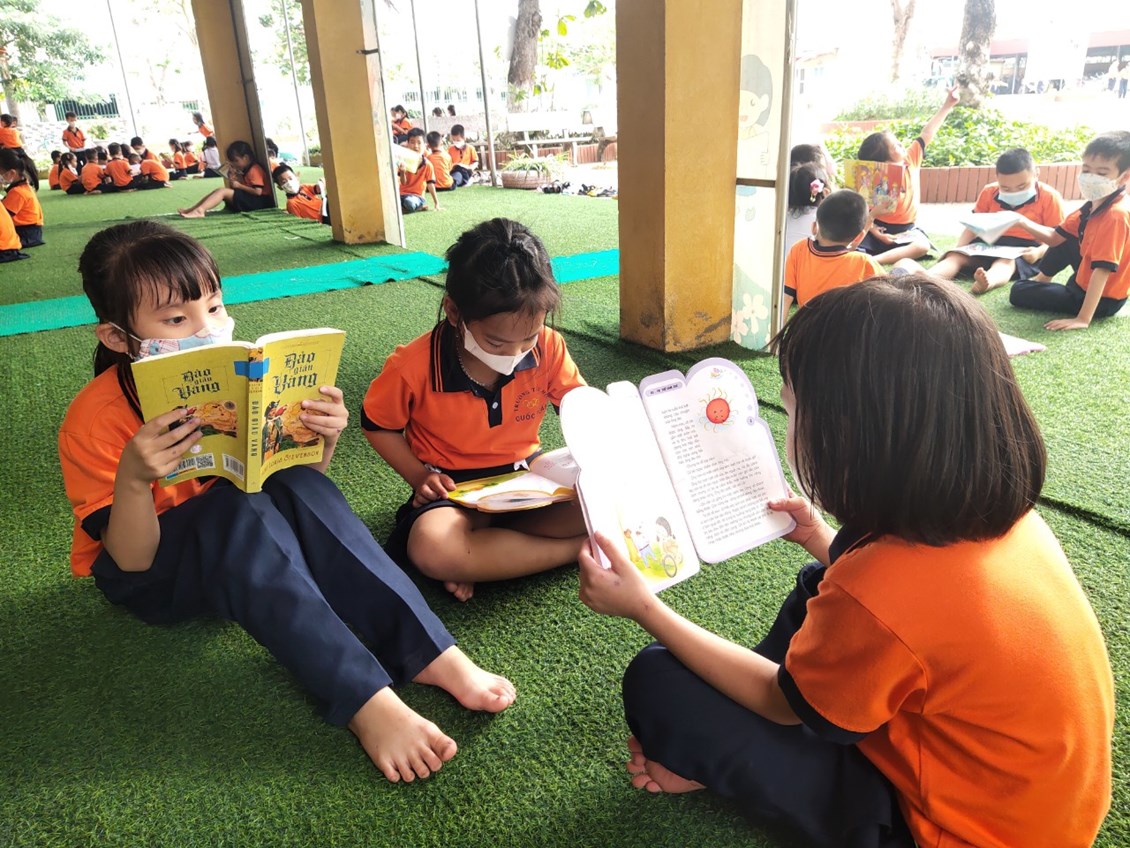 Trong các giờ ra chơi, các bạn học sinh say sưa đọc các cuốn sách hay được lấy từ Thư viện từng lớp cũng như Thư viện thân thiện của nhà trường. Từng nhóm, từng nhóm ngồi đọc trong lớp, trên ghế đá, dưới gốc cây hay ở thảm cỏ xanh của thư viện. Các bạn học sinh không chỉ đọc mà còn tìm hiểu về nội dung và các nhân vật trong cuốn sách. Sau đó, các bạn tập kể lại câu chuyện vừa đọc. Với sự sáng tạo cùng với lời thoại tự nhiên của các em học sinh lớp 1, 2; những nhân vật như công chúa Tóc Mây, A li ba ba, hoàng tử Ếch, Thạch Sanh... hiện lên thật ngộ nghĩnh và đáng yêu. Còn các anh chị lớp 3, 4, 5 lớn hơn thì phân công nhau đóng thành các vai để cùng nhau kể lại câu chuyện. Với sự giúp đỡ- góp ý của thầy cô chủ nhiệm, nội dung câu chuyện nào cũng được các bạn kể lại thật rành mạch và hấp dẫn. Video, clip, ảnh chụp các hoạt động này được tập hợp gửi về Ban giám hiệu và giáo viên Tổng phụ trách. Đây chính là những vị giám khảo sẽ lựa chọn ra những cá nhân xuất sắc nhất của từng lớp để tham gia Cuộc thi Đại sứ văn hóa đọc, Hội thi thiếu nhi vẽ tranh theo sách báo và Cuộc thi tuyên truyền kể chuyện sách báo năm 2022 được tổ chức với quy mô toàn thành phố trong thời gian tới.