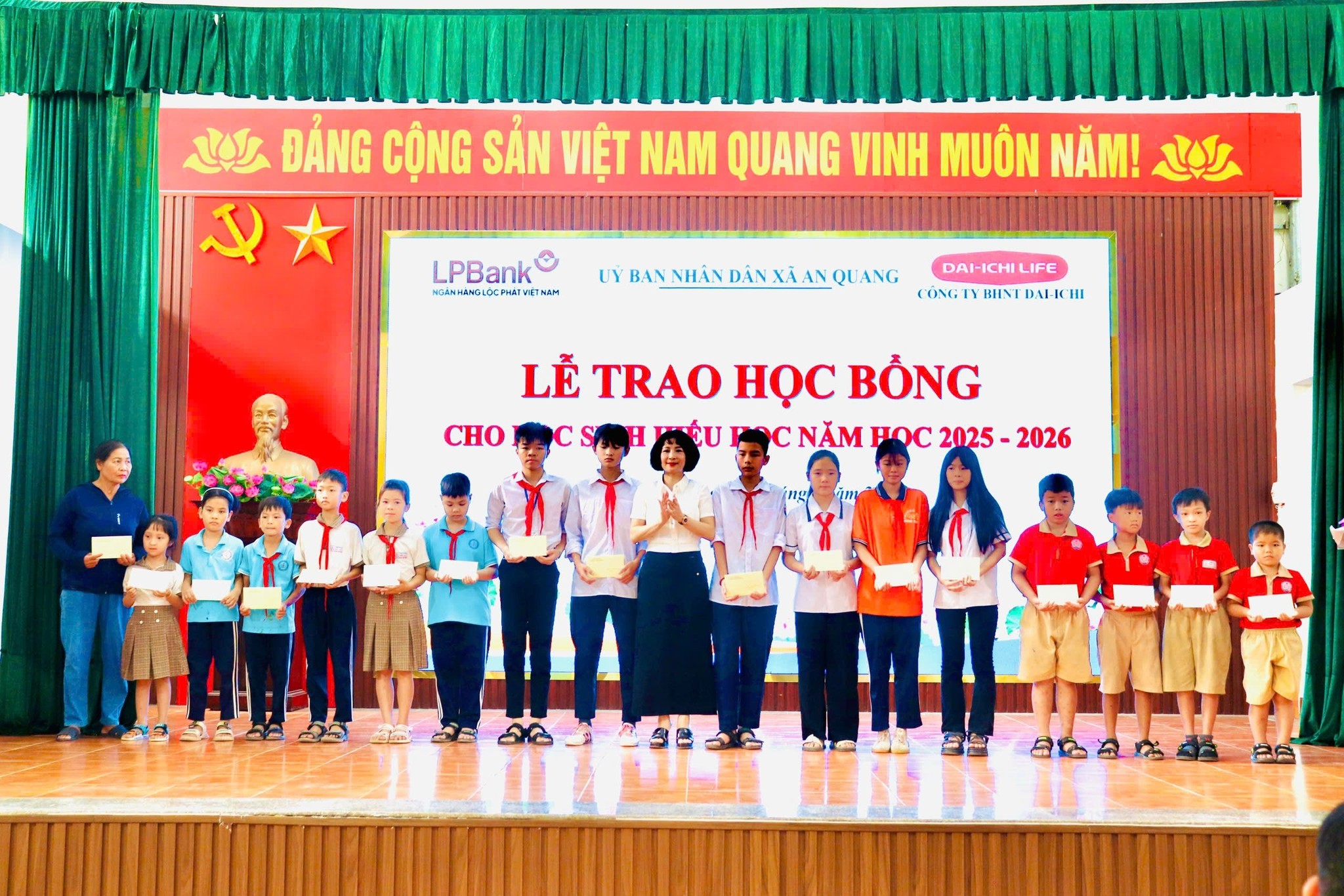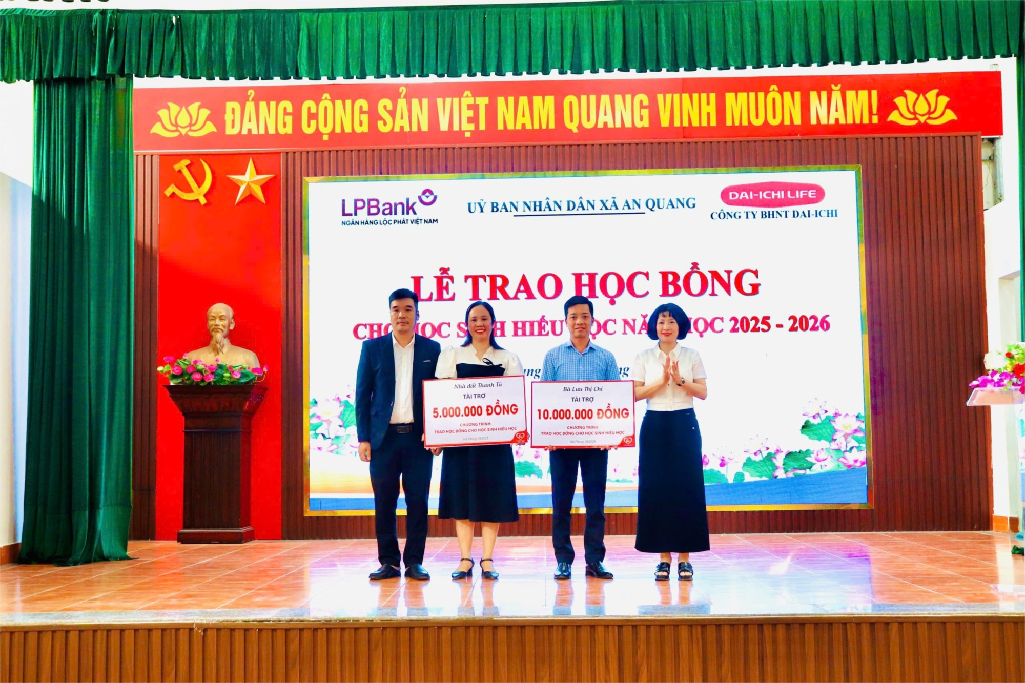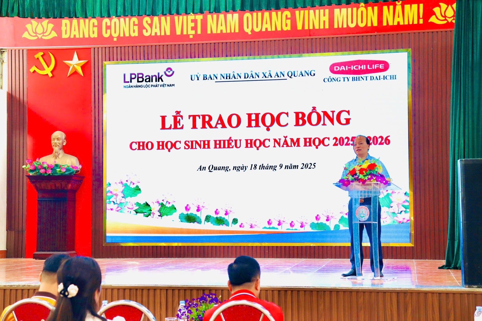 òa chung không khí khai giảng năm học mới 2025 – 2026, Đảng ủy – HĐND – UBND – Ủy ban MTTQ xã An Quang đã phối hợp cùng các đơn vị, doanh nghiệp và các nhà hảo tâm tổ chức chương trình trao học bổng cho học sinh hiếu học.