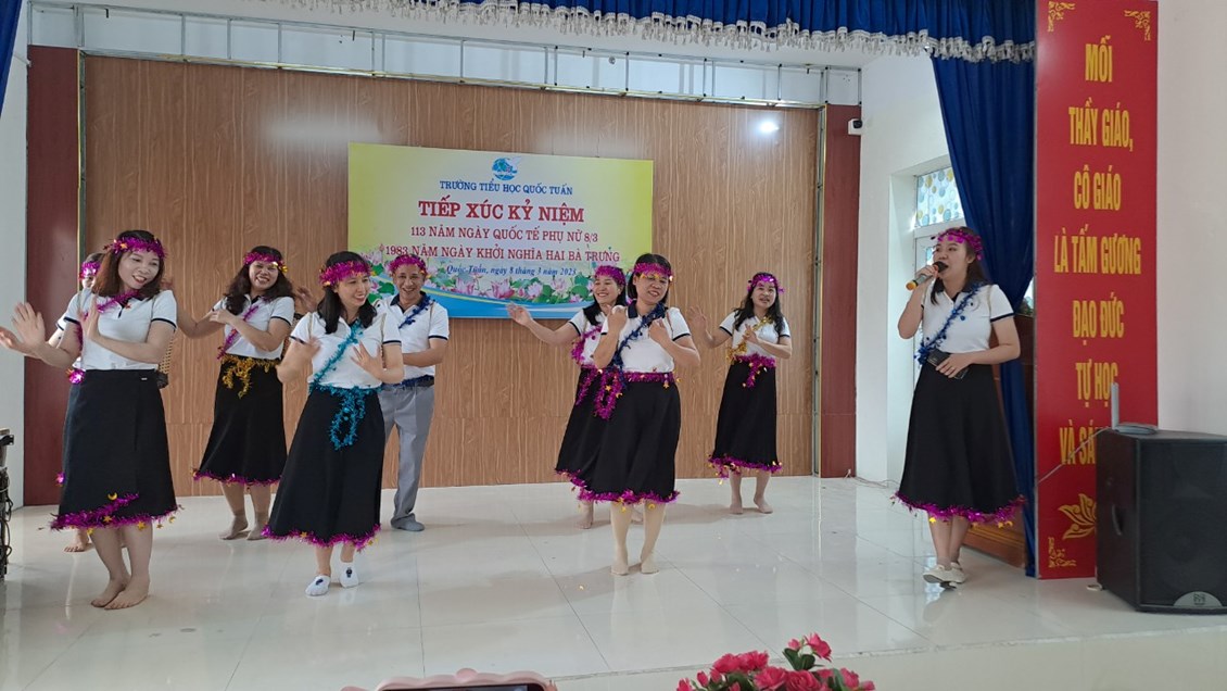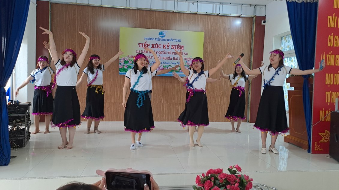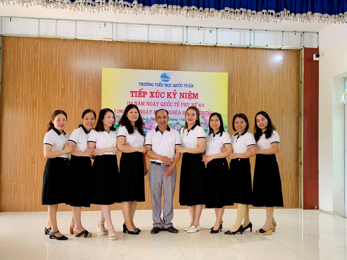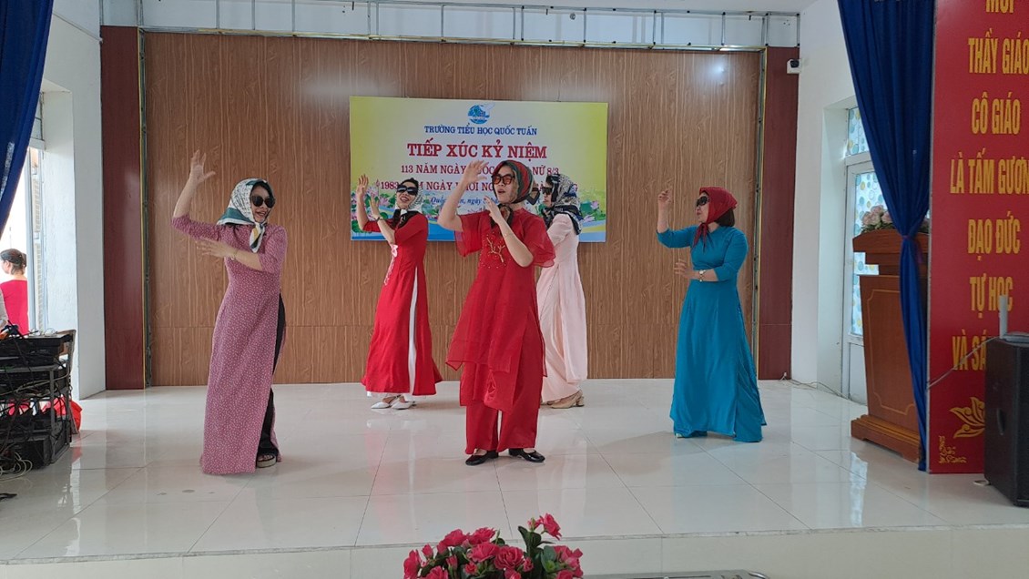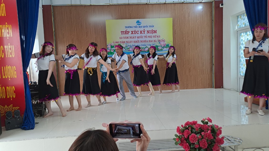 Lễ kỉ niệm ngày 8 tháng 3 năm nay của trường Tiểu học Quốc Tuấn năm nay tràn đầy niềm vui. Sau lời phát biểu ngắn gọn, súc tích của đồng chí chủ tịch công đoàn Phạm Thị Duyên về ý nghĩa ngày 8 tháng 3, nhà trường trao quà cho các đồng chí đạt thành tích xuất sắc trong năm học 2021- 2022. Rồi màn thi văn nghệ đặc sắc giữa 5 tổ trong trường diễn ra. Đó là các tiết mục múa hát của tổ 1, trình diễn thời trang của tổ 2, đi người mẫu của tổ 3, hát kết hợp nhảy của tổ 4 và nhảy hiện đại của tổ 5. Phần trao thưởng được mong đợi nhất được khép lại bằng giải nhất cùng giải trang phục ấn tượng dành cho tiết mục của tổ 1.Buổi lễ diễn ra gọn gàng trong thời gian chưa đến1 tiếng đồng hồ nhưng mang lại thật nhiều tiếng cười, đó quả thực là 1 ngày đầy ý nghĩa với các nữ cán bộ giáo viên, công nhân viên trường Tiểu học Quốc Tuấn.
