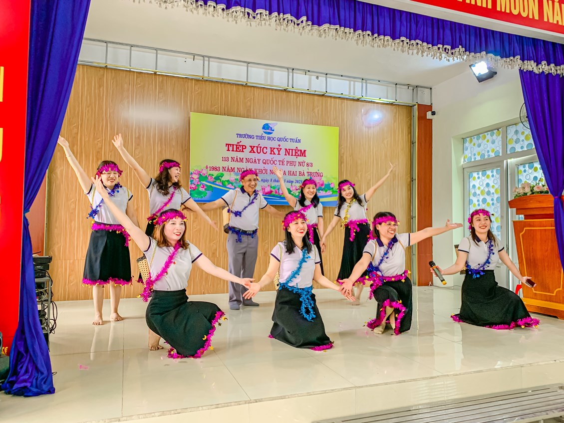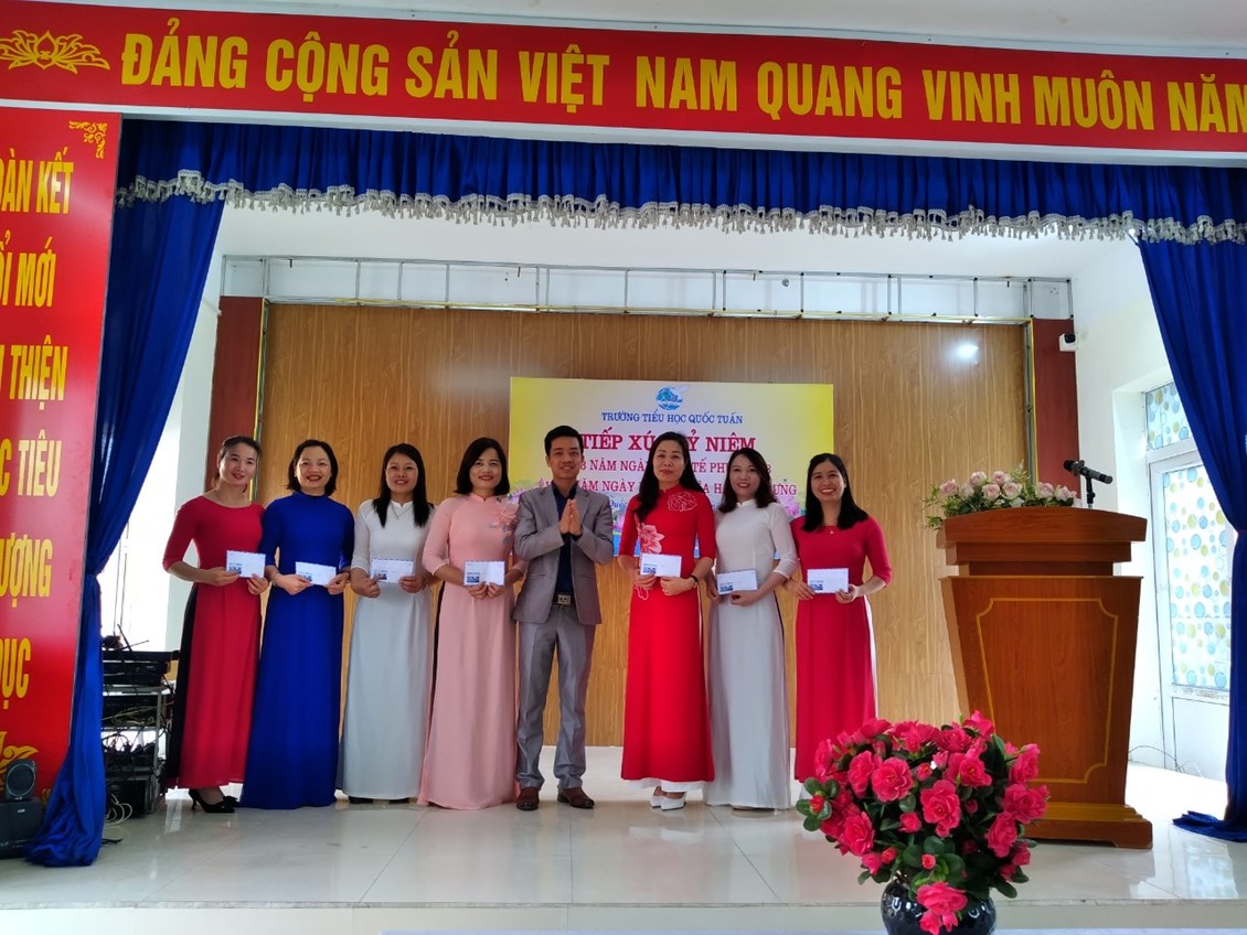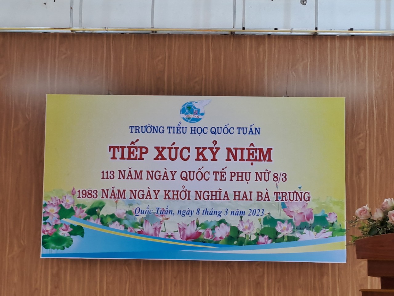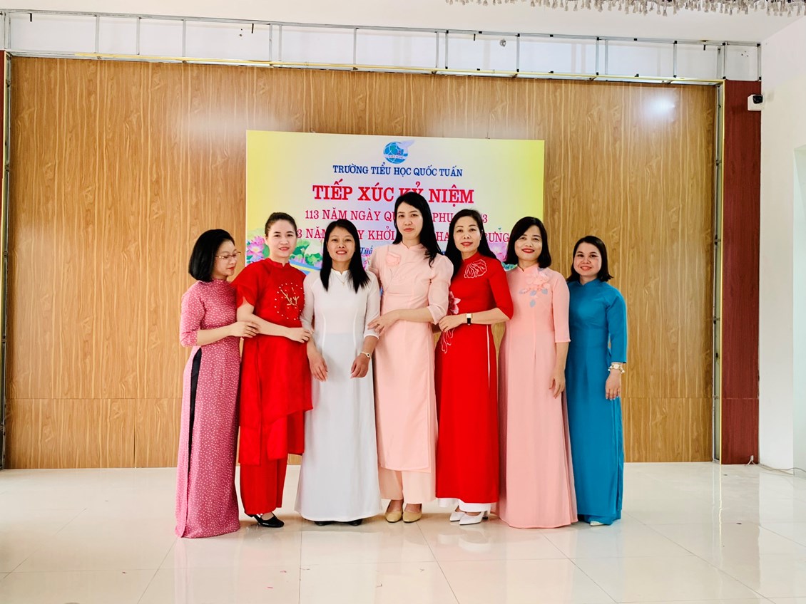 Lễ kỉ niệm ngày 8 tháng 3 năm nay của trường Tiểu học Quốc Tuấn năm nay tràn đầy niềm vui. Sau lời phát biểu ngắn gọn, súc tích của đồng chí chủ tịch công đoàn Phạm Thị Duyên về ý nghĩa ngày 8 tháng 3, nhà trường trao quà cho các đồng chí đạt thành tích xuất sắc trong năm học 2021- 2022. Rồi màn thi văn nghệ đặc sắc giữa 5 tổ trong trường diễn ra. Đó là các tiết mục múa hát của tổ 1, trình diễn thời trang của tổ 2, đi người mẫu của tổ 3, hát kết hợp nhảy của tổ 4 và nhảy hiện đại của tổ 5. Phần trao thưởng được mong đợi nhất được khép lại bằng giải nhất cùng giải trang phục ấn tượng dành cho tiết mục của tổ 1.Buổi lễ diễn ra gọn gàng trong thời gian chưa đến1 tiếng đồng hồ nhưng mang lại thật nhiều tiếng cười, đó quả thực là 1 ngày đầy ý nghĩa với các nữ cán bộ giáo viên, công nhân viên trường Tiểu học Quốc Tuấn.